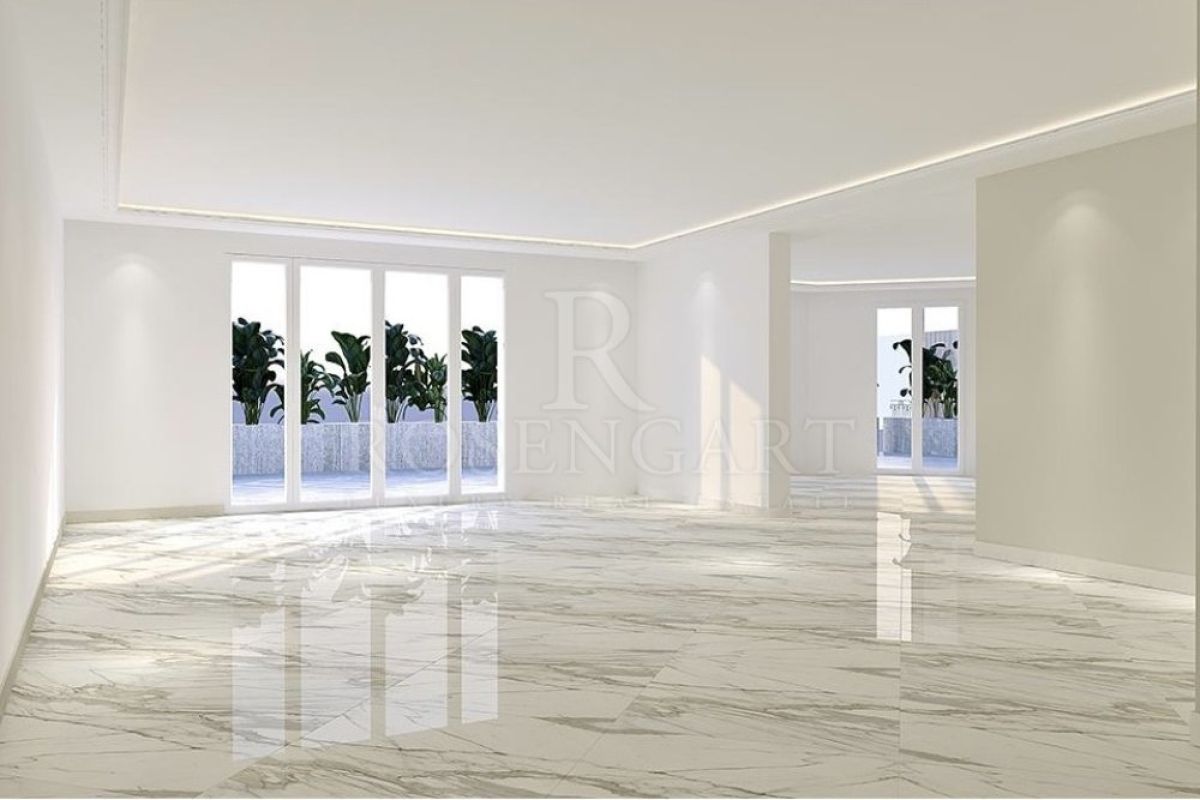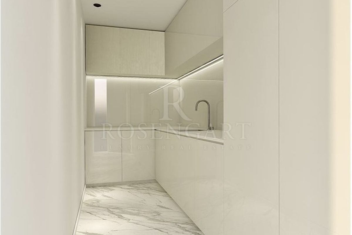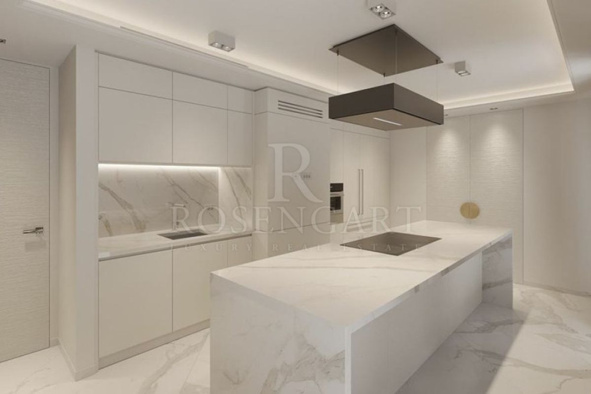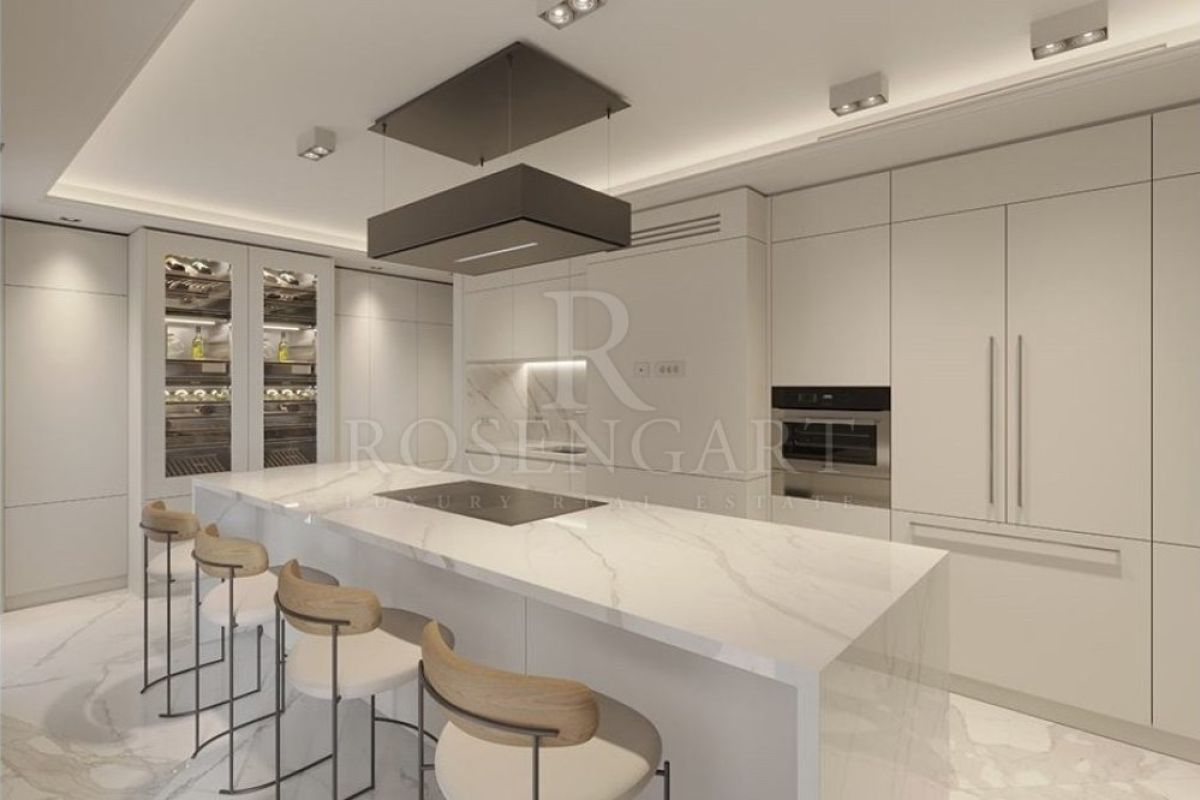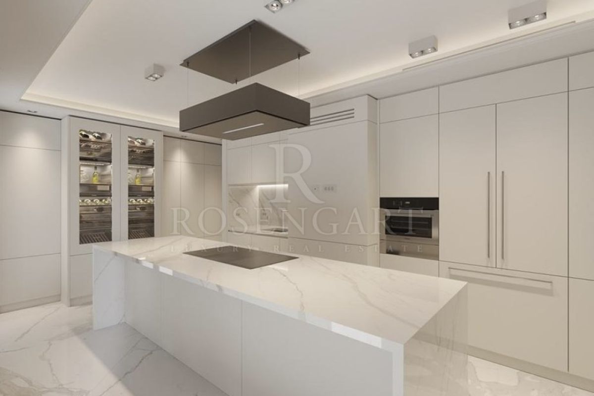 The spacious double living and dining area flows effortlessly onto a generous terrace, complemented by a 25sqm veranda—perfect for year-round enjoyment of the Mediterranean climate. A fully equipped, expansive kitchen caters to culinary enthusiasts, while the grand reception area offers an impressive space to welcome guests.