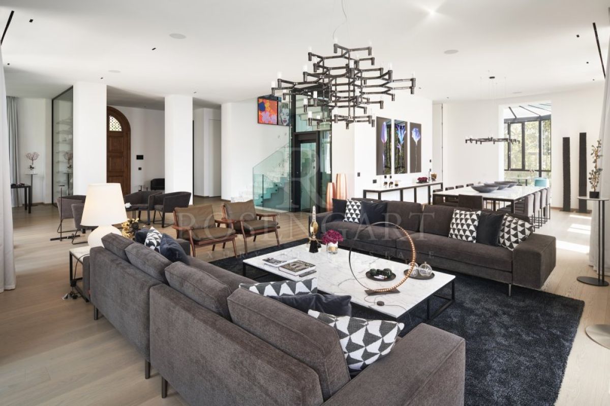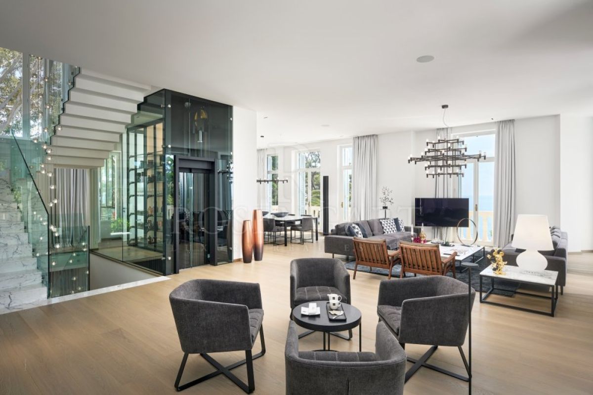 The reception level of 220m2 is comprised of a large double reception, a living room, a dining room, a study, a separate kitchen, a winter veranda overlooking the lush garden, without forgetting the spectacular staircase in Carrara marble, the glass elevator, and the huge window wine cellar.
