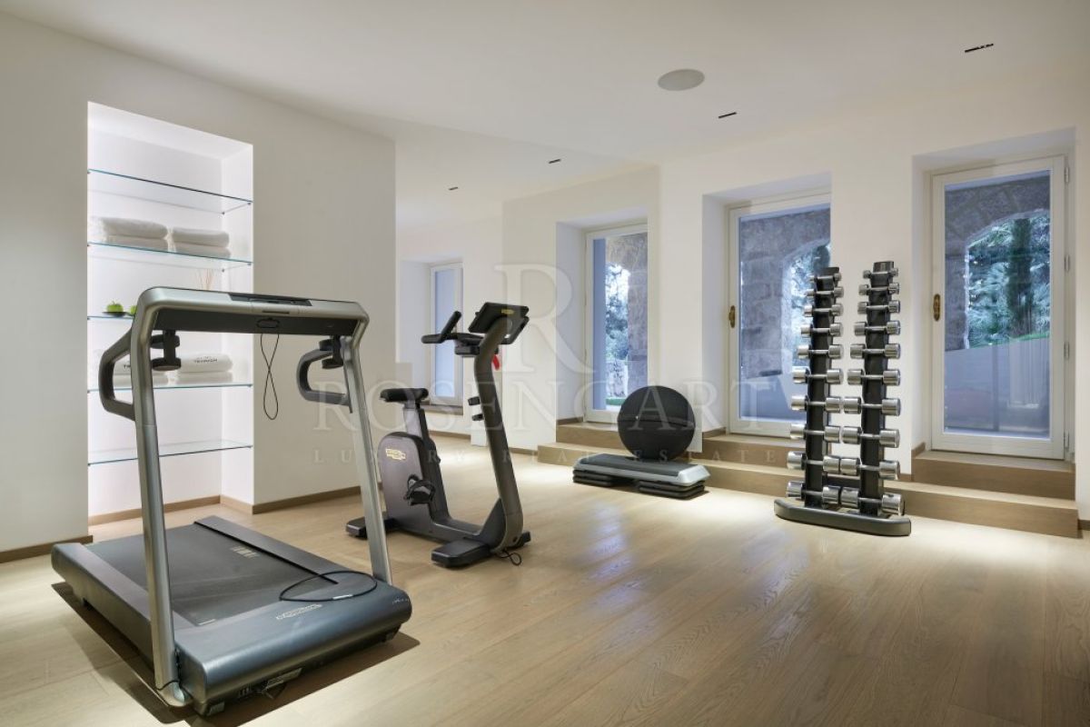 The garden level is home to 2 en-suite bedrooms, as well as the staff area (laundry room, professional kitchen for catering) and all the entertainment part of the house: Cinema lounge, fitness room opening onto the garden, sauna, shower, toilet, and access to the pool area.