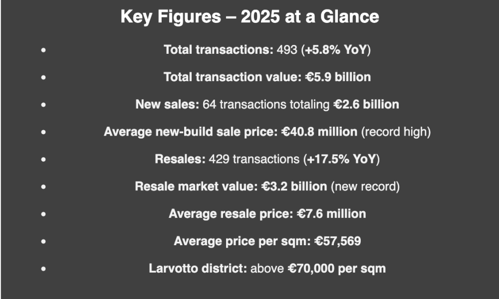 The resale market, by contrast, regained momentum. A total of 429 properties changed hands, up 17.5% year-on-year, pushing total resale volume to a new high of €3.2 billion. The average resale price rose to €7.6 million, reflecting demand for recently delivered high-end developments.