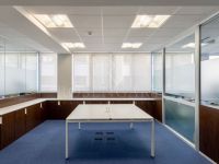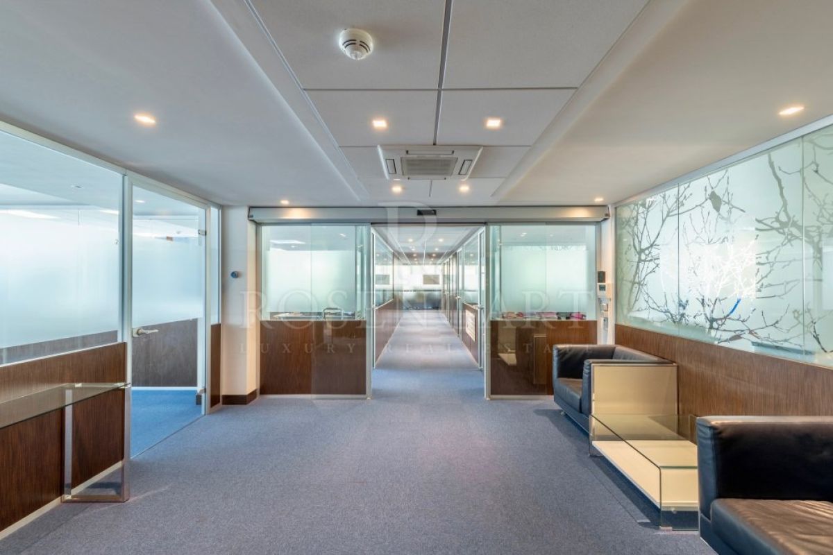 Enveloped by shades of light blue, gray and brown, overlooking the neighborhood of Fontvieille and Boulevard Charles III, the offices are separated by sound glass partitions, allowing natural light to flow through the spaces.