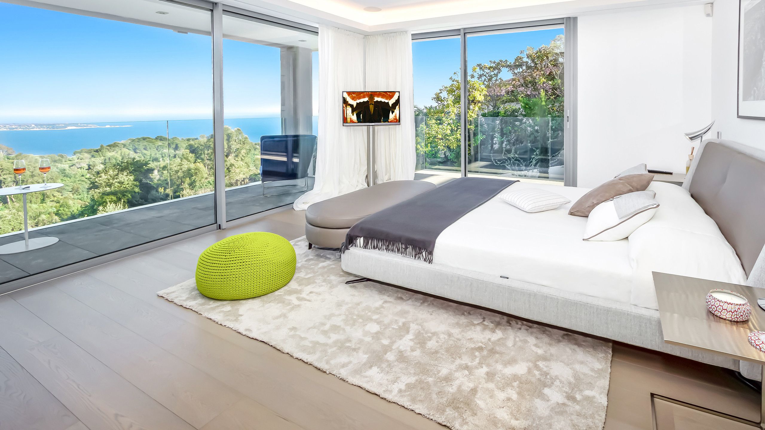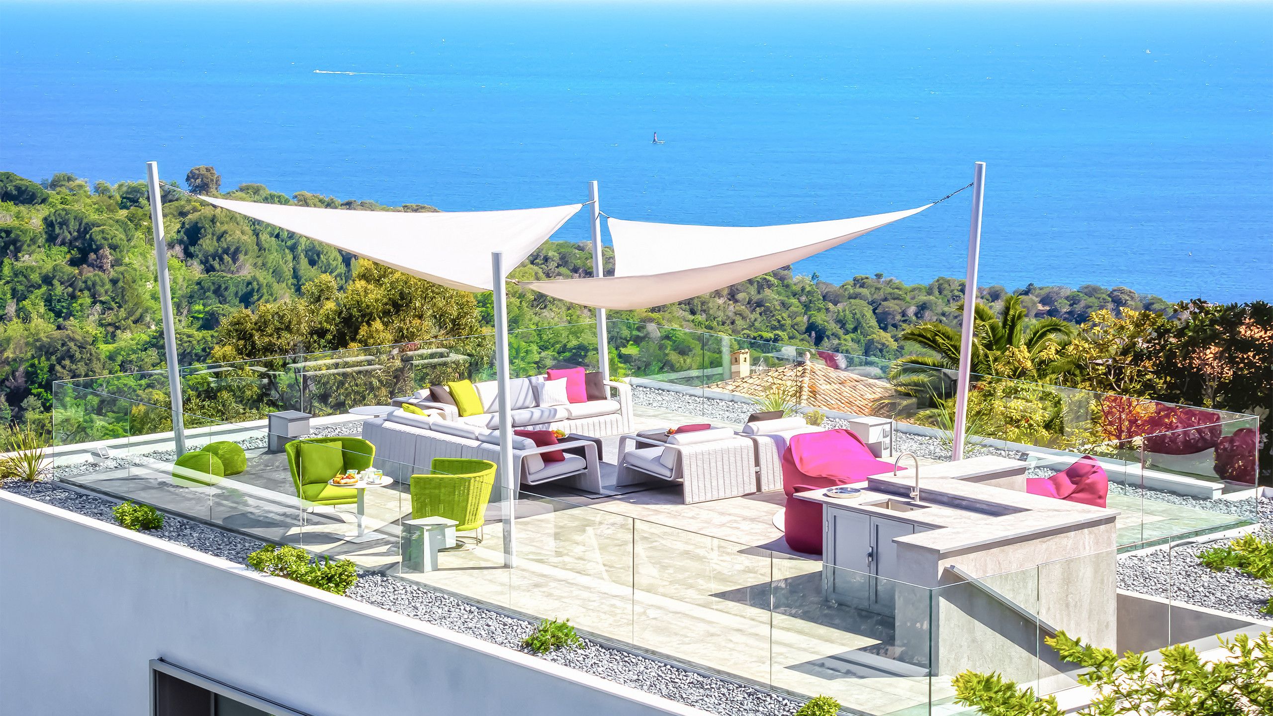 A staircase leads up to a rooftop terrace that serves as the villa’s very own private observatory. This spacious pedestal is made up of various different open spaces such as a summer bar area, sweeping curtained lounge that literally dominates the surroundings like the Cannes observatory, inspiring thoughts of memories to come.