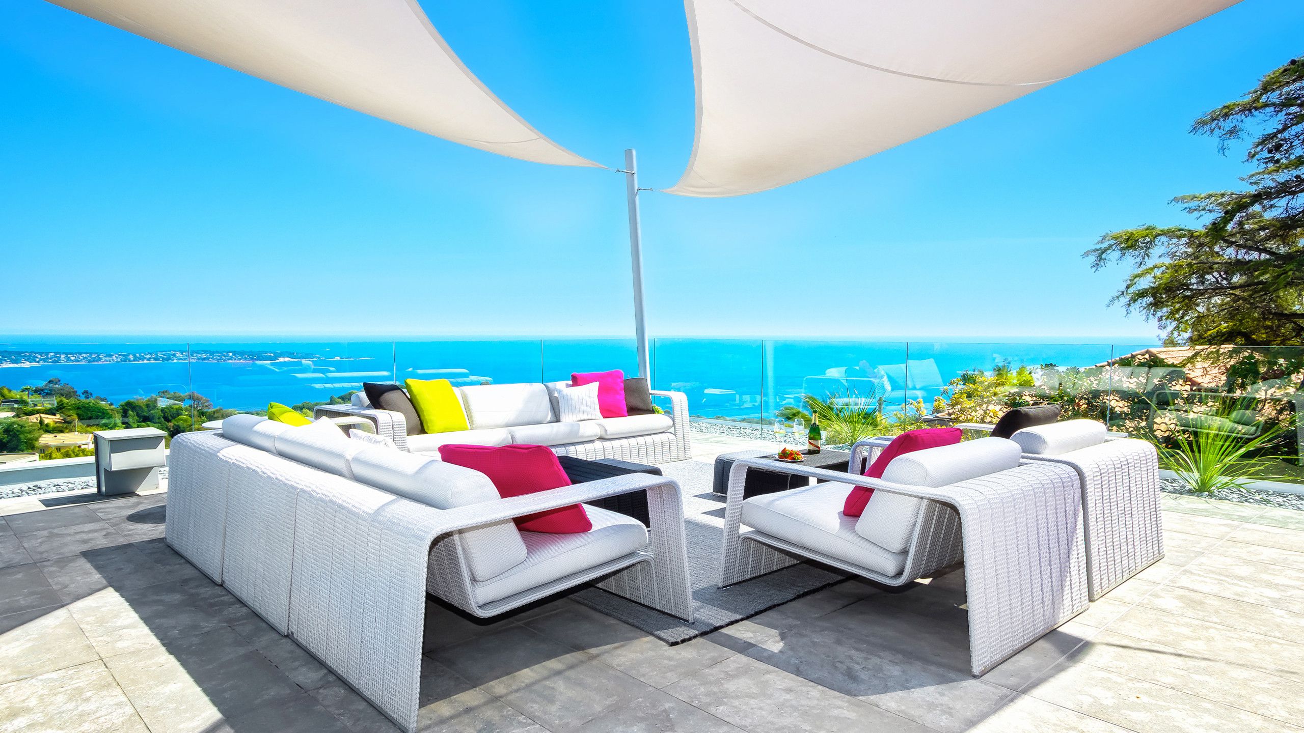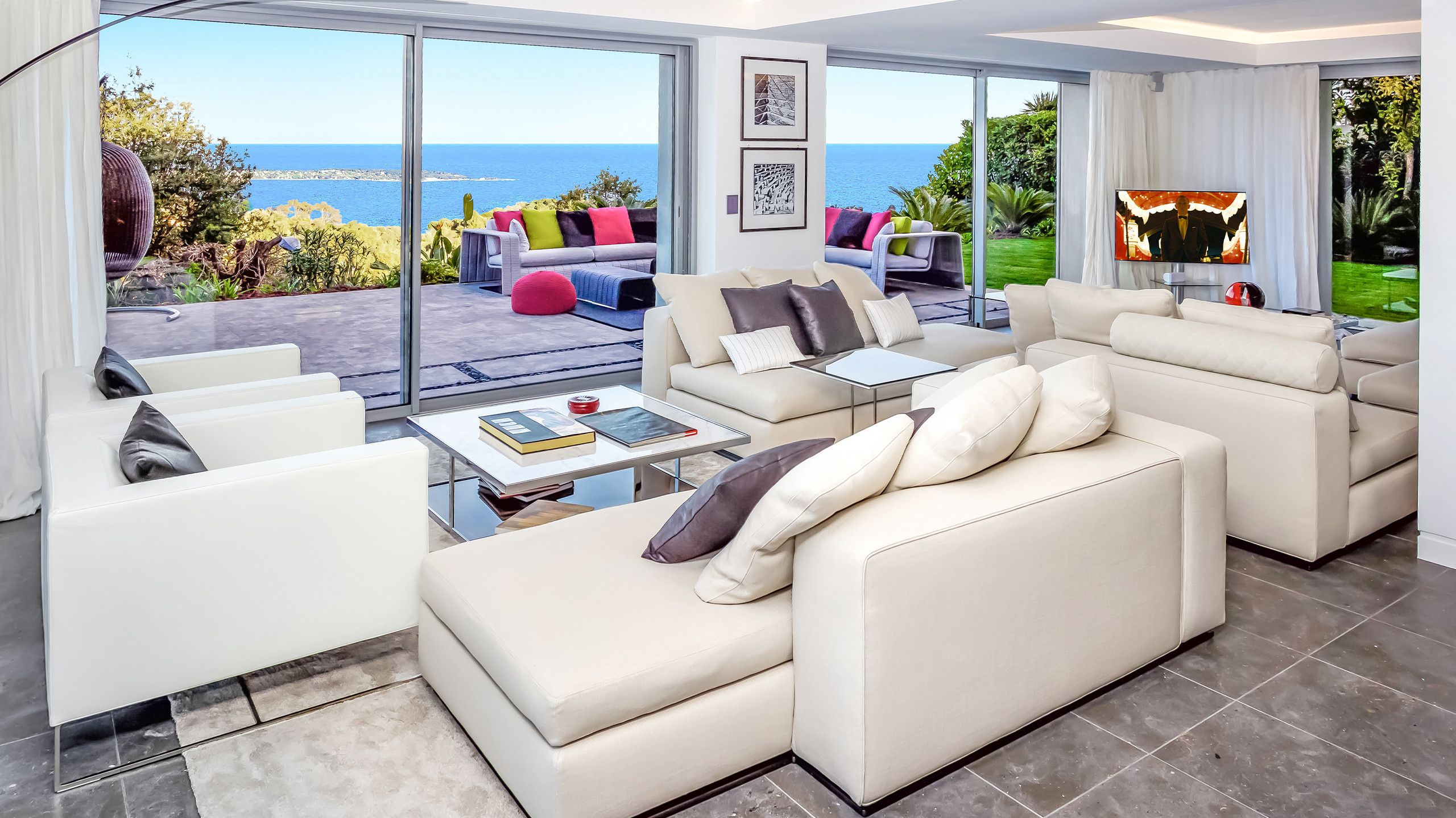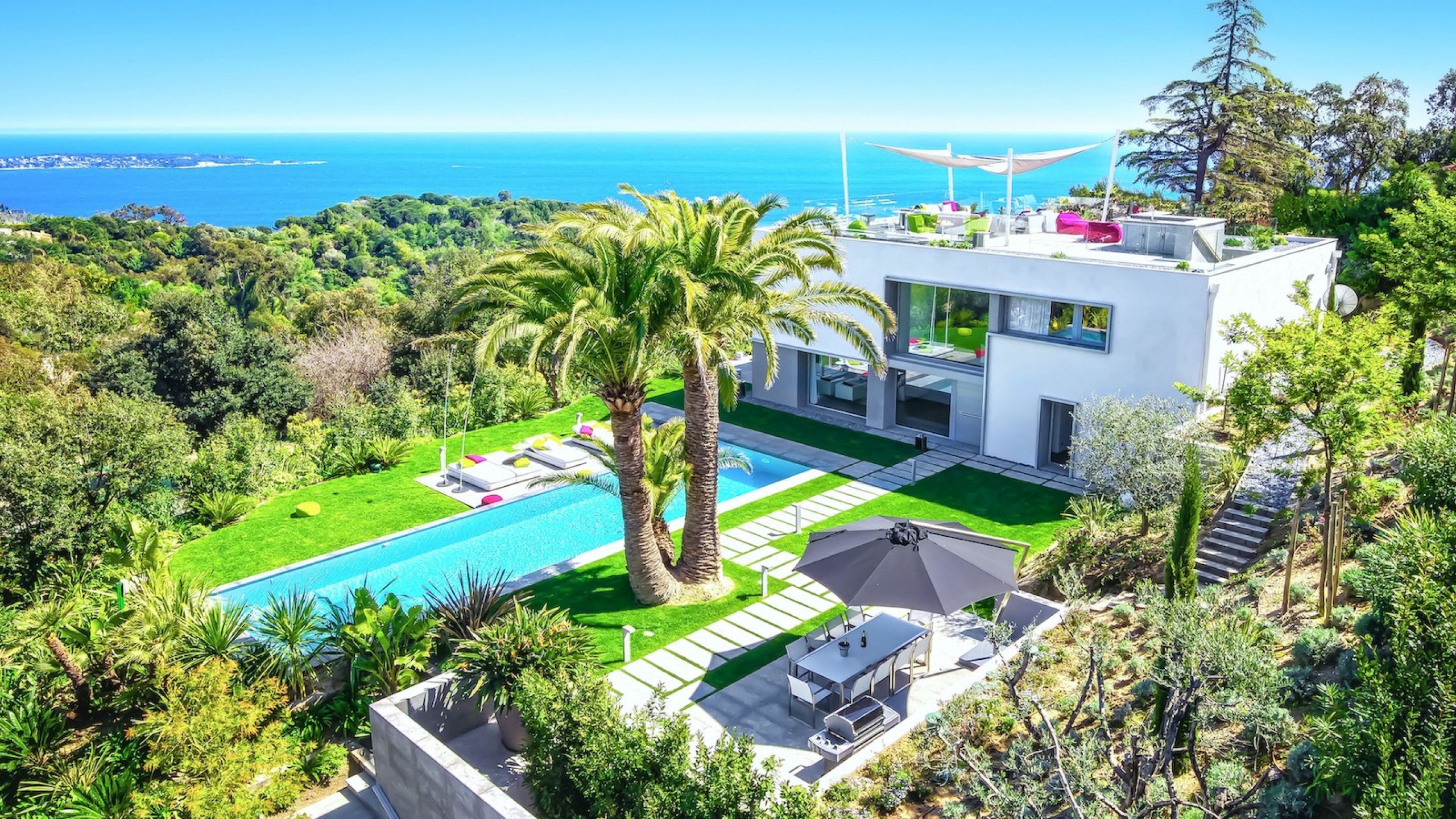 The landscaped garden boasts a rich variety of atmospheres and feels: a long infinity pool with poolside and underwater music facility that offers sweeping views of the Mediterranean Sea and the garden, a sheltered pool house with summer kitchen tucked away in a garden of aromatic herbs and facing out onto the sea, a lounge that acts as an extension of the living room giving onto the view and a secret garden to the south that offers an alternative view of the property.