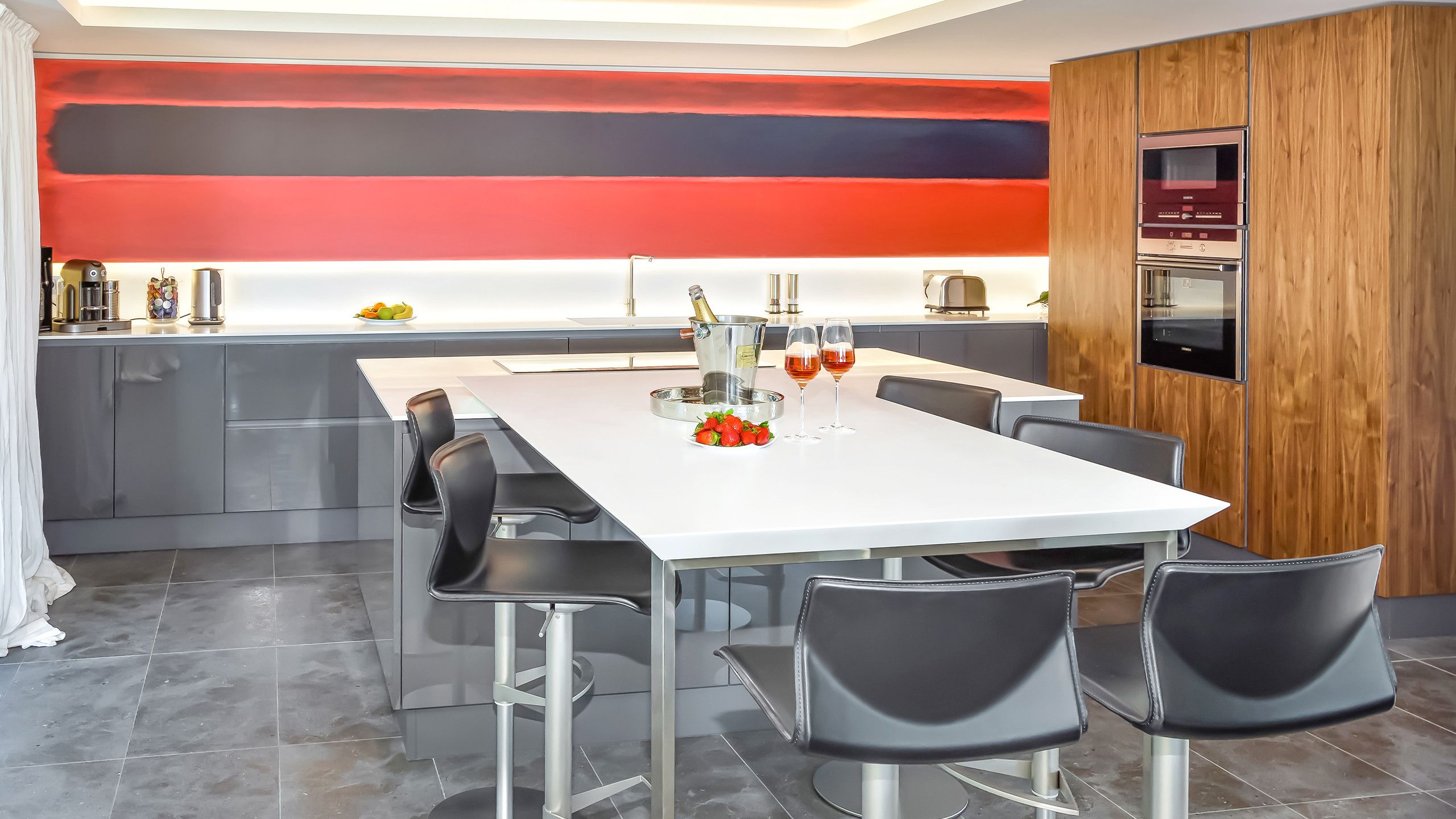 To bring some colours accents to this pure white and grey design, an abstract expressionism inspired by Rohtko has been crafted onto kicthen's wall.
