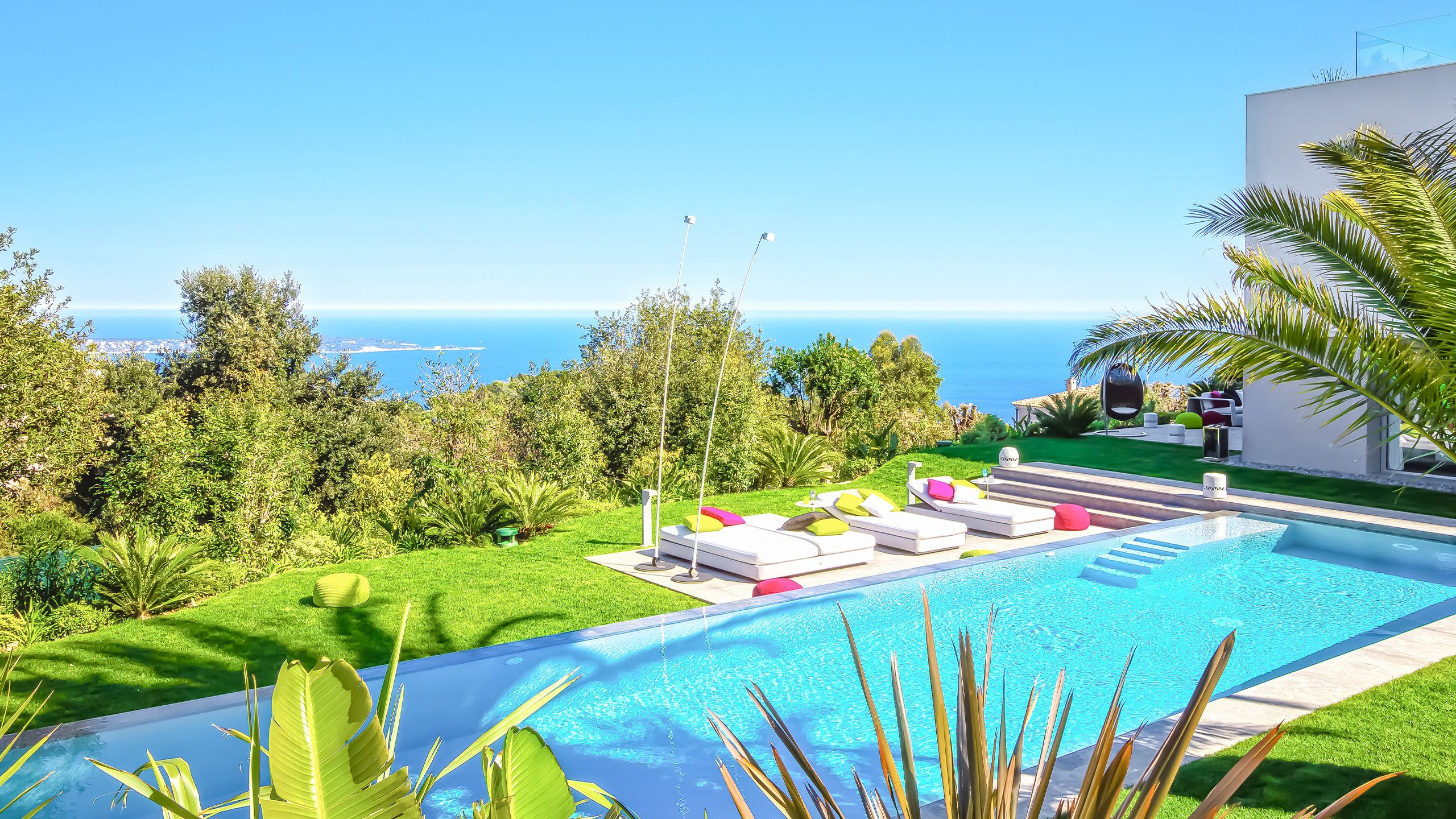 A third section follows, featuring a front wall on which the name of the property is displayed. A staircase containing steps leads seamlessly towards a levelled garden enclosing the pool areas and a pool house set against a backdrop of the sea.