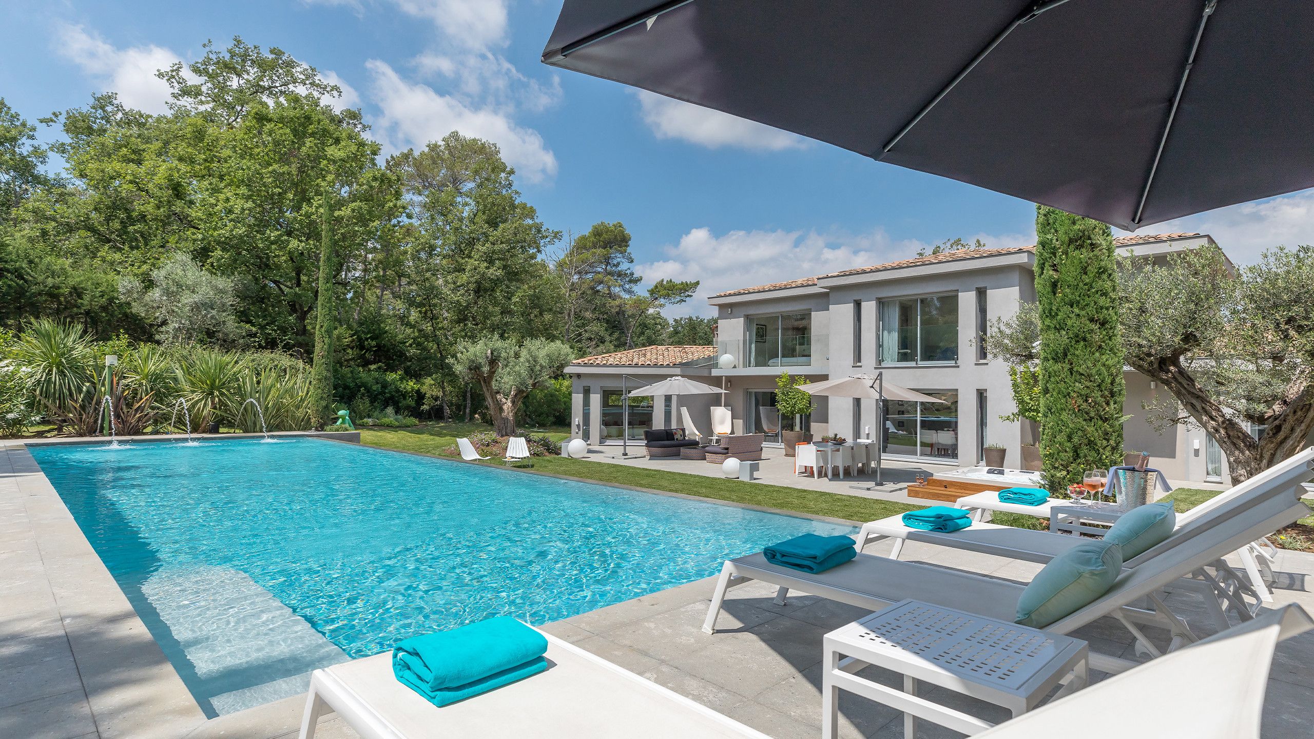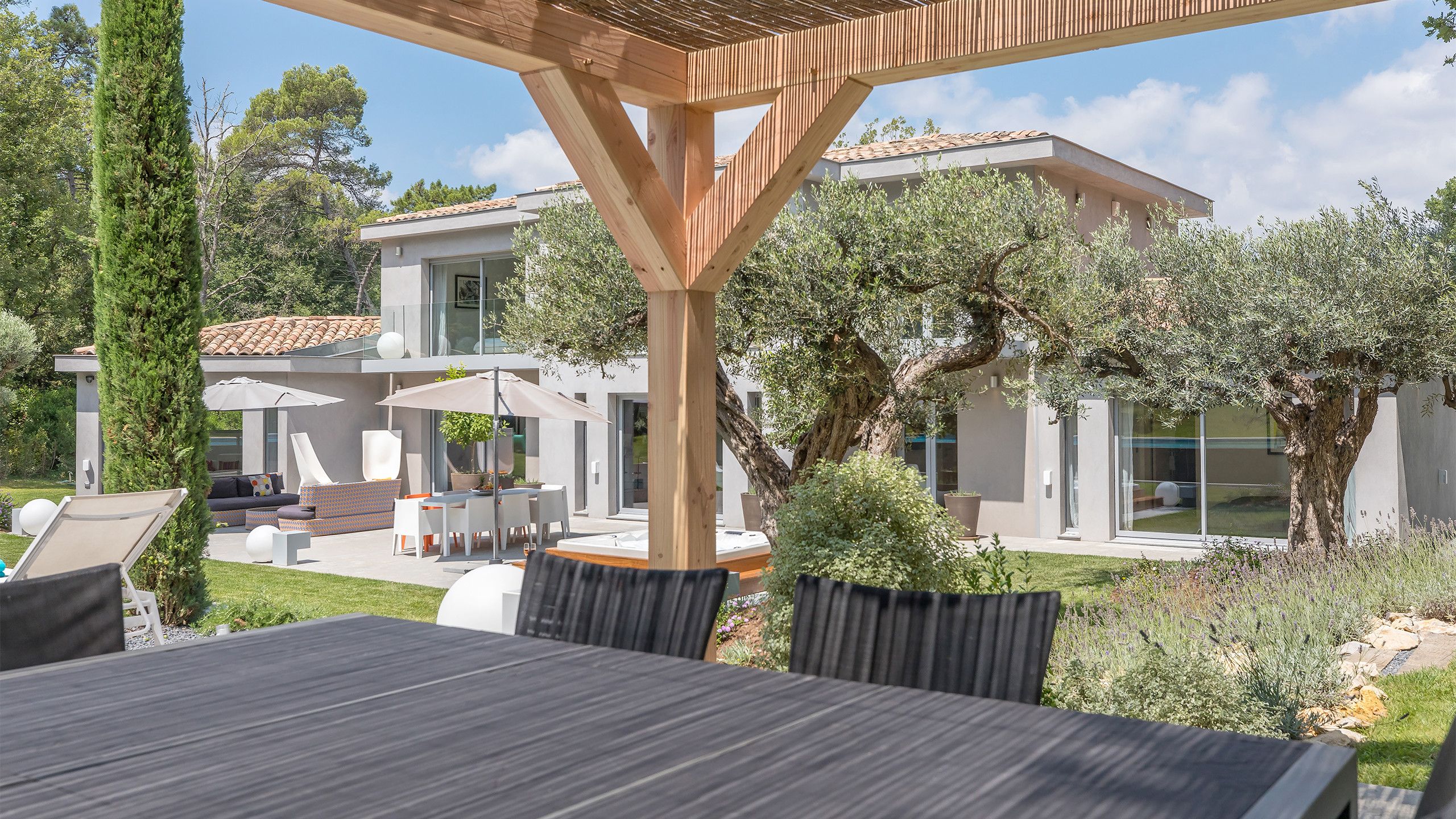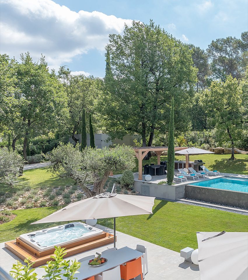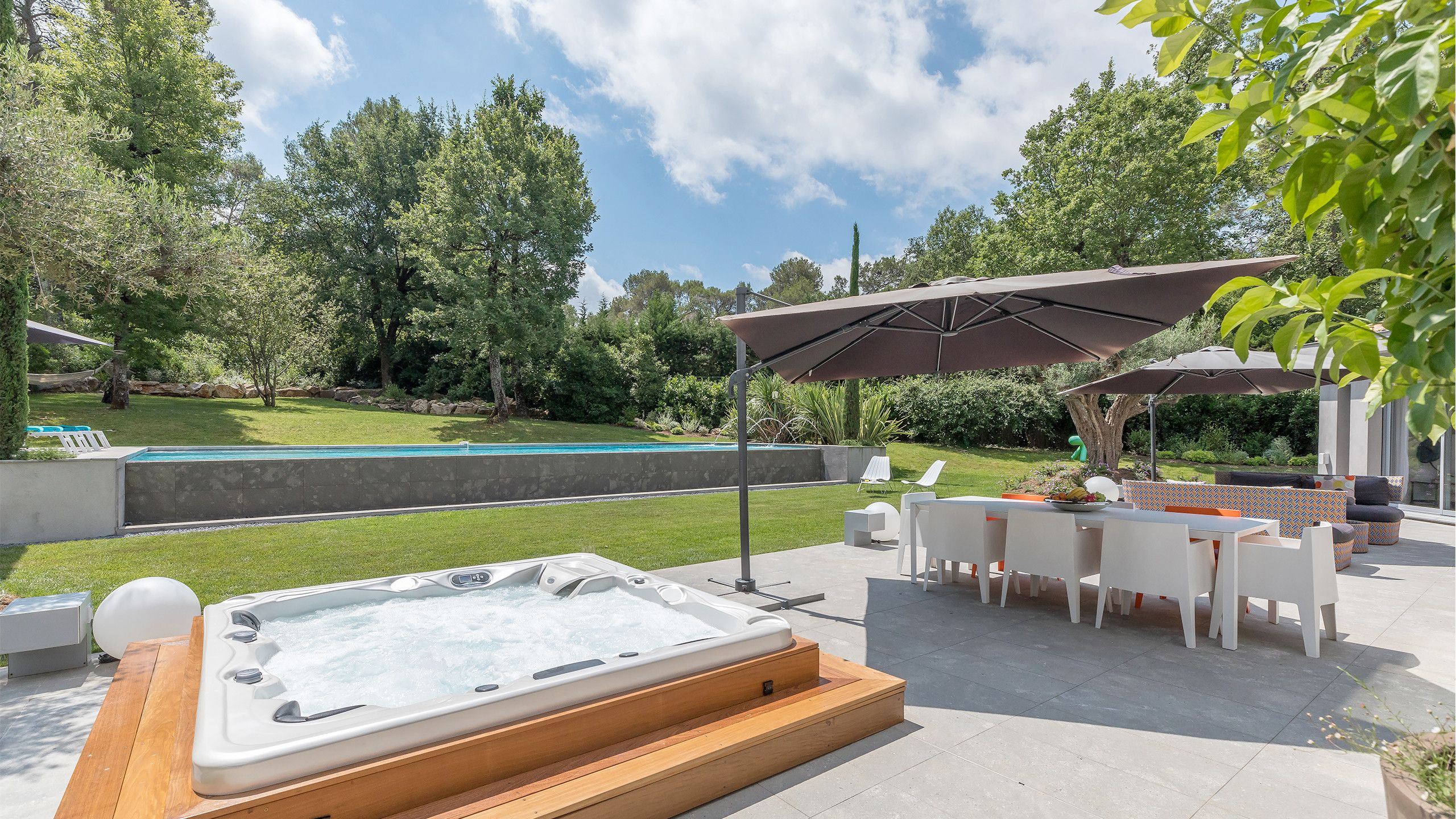 The living area adorned by large bay windows is extended by the landscaped garden that is divided into several areas; a lounge and dining terrace with a luxurious and generous jacuzzi, a huge infinity pool of 15m and a pool house with a summer kitchen sheltered by natural wooden beams, within a greenery park with cypress and century old olive trees, the whole highlighted by a complete outdoor lighting system.
