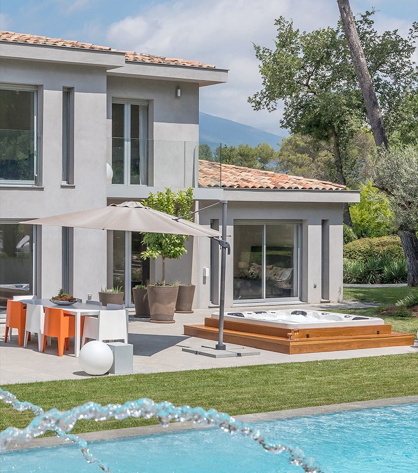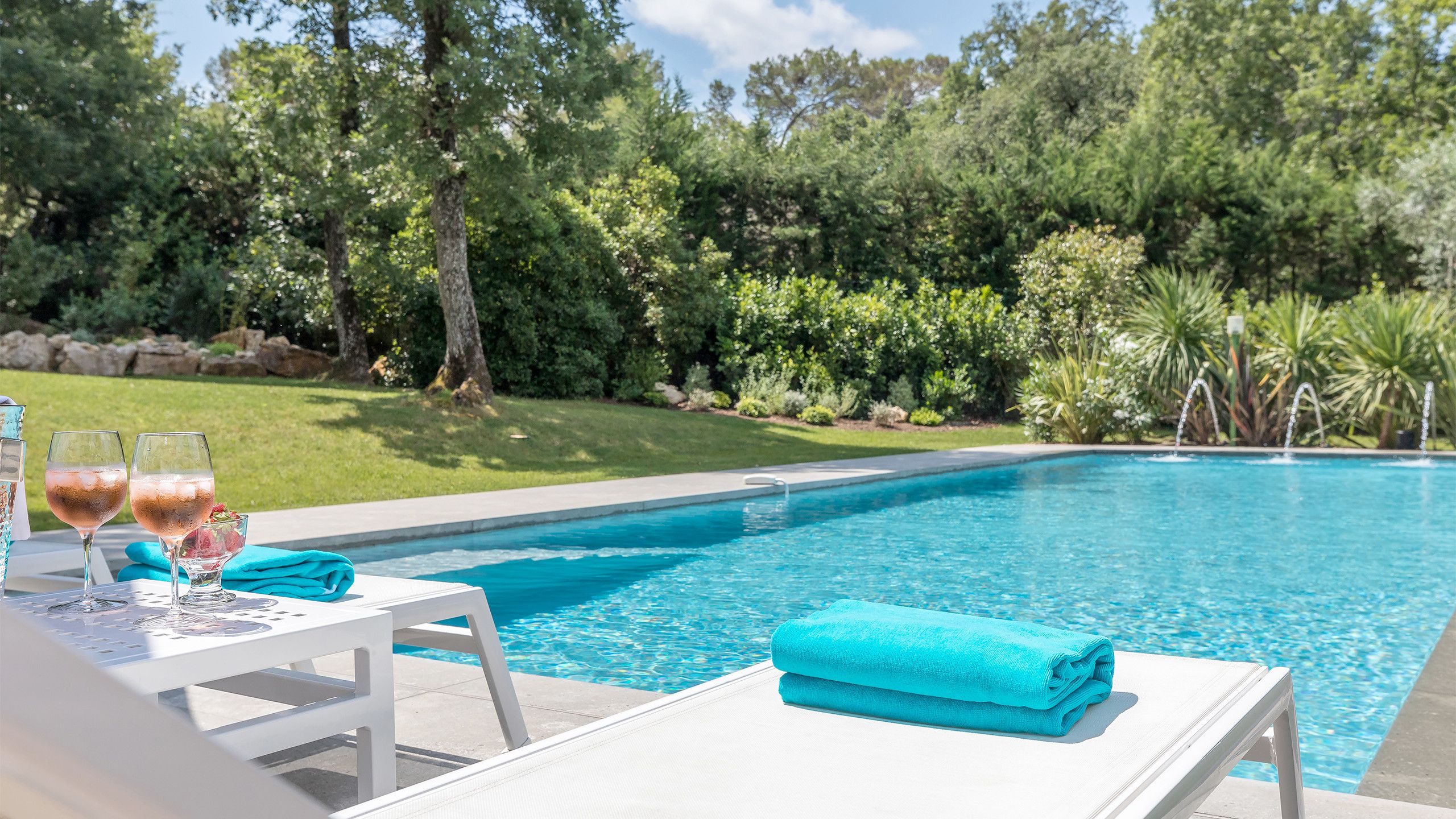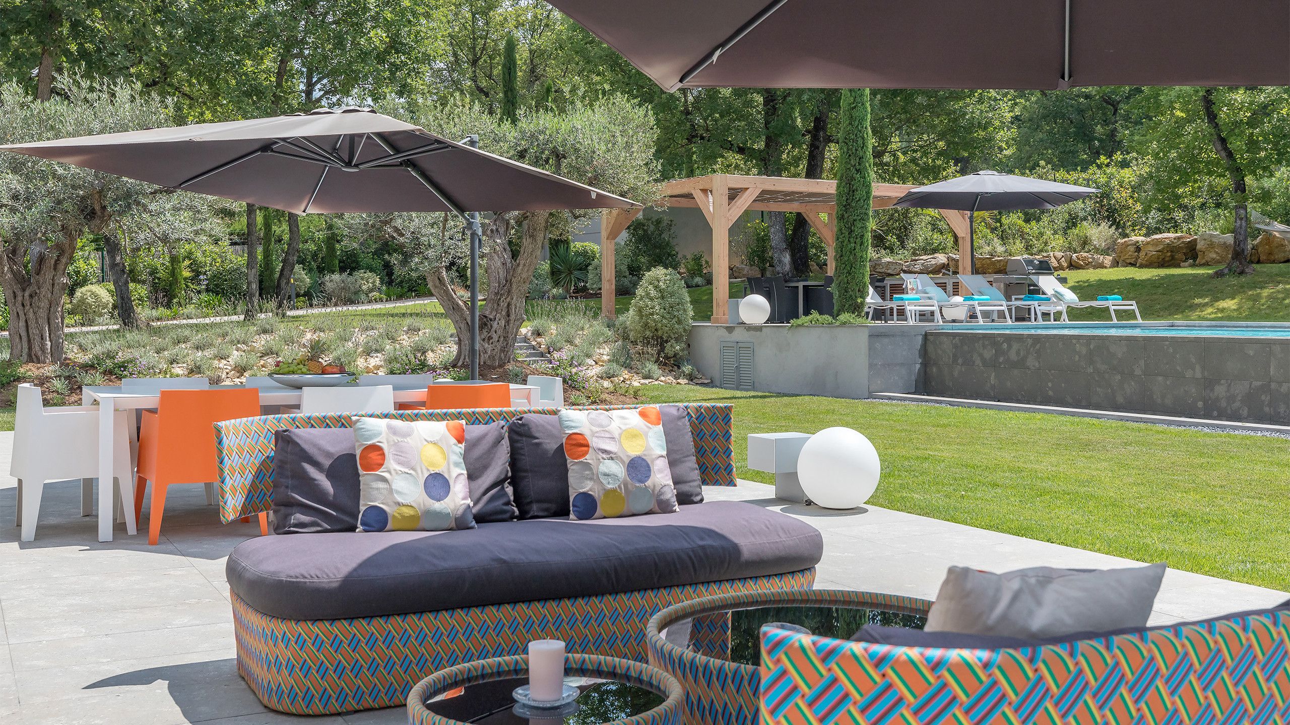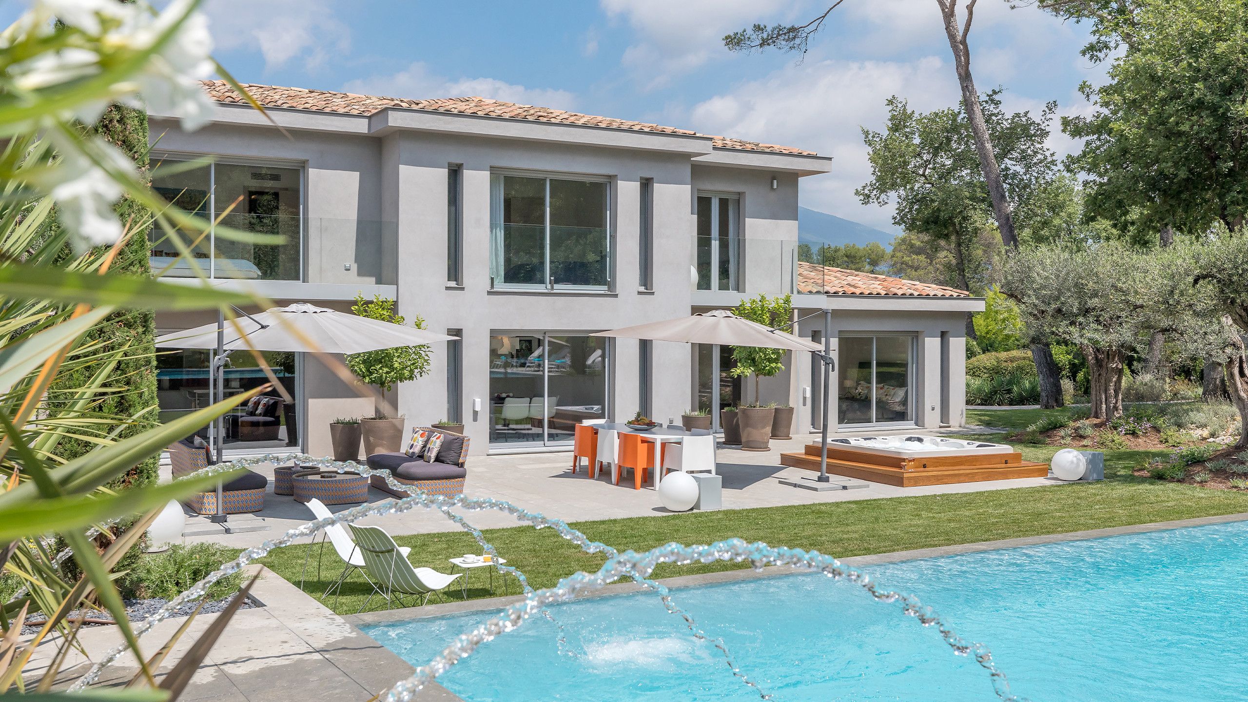 The living area adorned by large bay windows is extended by the landscaped garden that is divided into several areas; a lounge and dining terrace with a luxurious and generous jacuzzi, a huge infinity pool of 15m and a pool house with a summer kitchen sheltered by natural wooden beams, within a greenery park with cypress and century old olive trees, the whole highlighted by a complete outdoor lighting system.